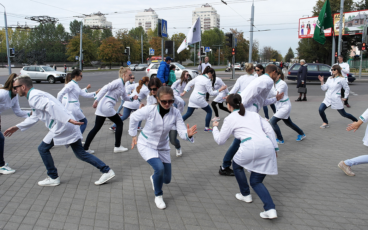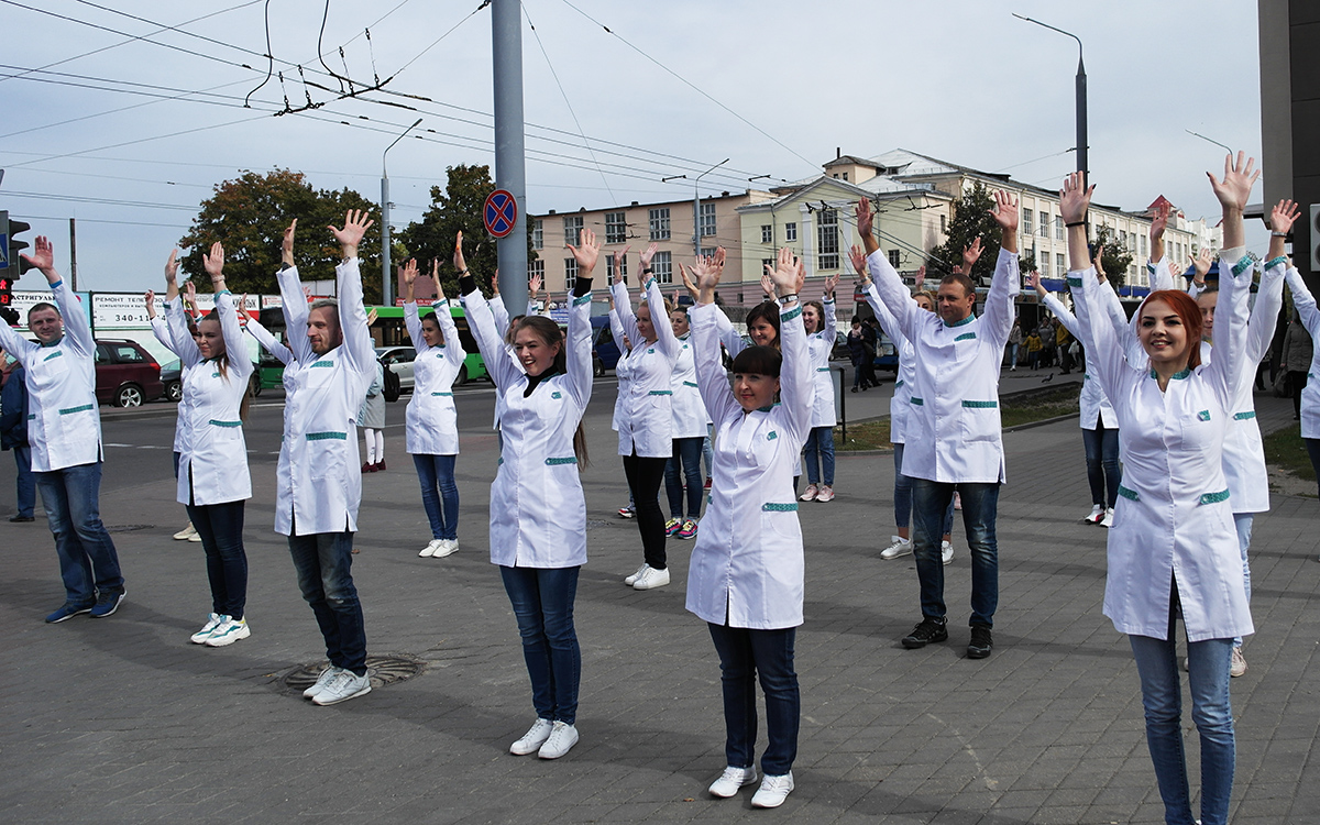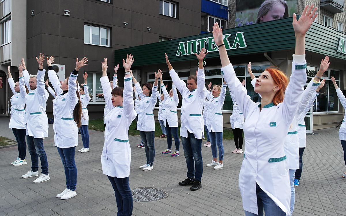 «Танцующие фармацевты?! Вот это да! Не может быть!», – прохожие и посетители аптеки №114 г.Гродно с трудом сдерживают удивление, позитив и эмоции. Еще бы! Не каждый же день увидишь зажигательный танец, организованный людьми в белых халатах, которых все привыкли встречать среди многочисленных лекарств в спокойной аптечной обстановке.
