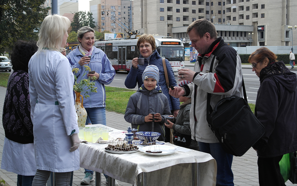 Ну а прохожие и посетители аптеки согревались не только динамичным танцем, но и горячим фиточаем и гематогеном, которые можно было попробовать в ходе организованной дегустации по случаю Дня фармацевта.