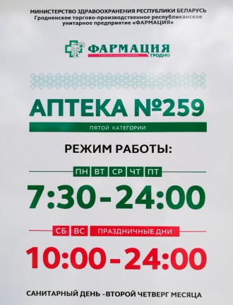 - Режим работы аптеки №259 по адресу ул.Огинского,19-139 (рядом со взрослой амбулаторией) в микрорайоне Ольшанка продлен до 24.00. Сейчас приобрести необходимые лекарства и средства защиты стало еще удобнее и доступней.