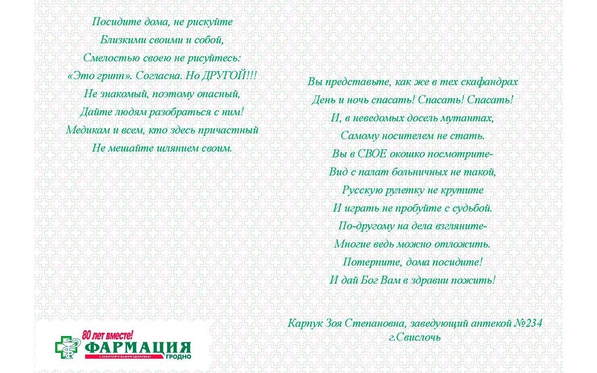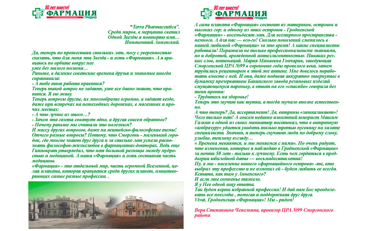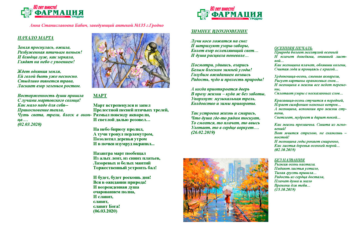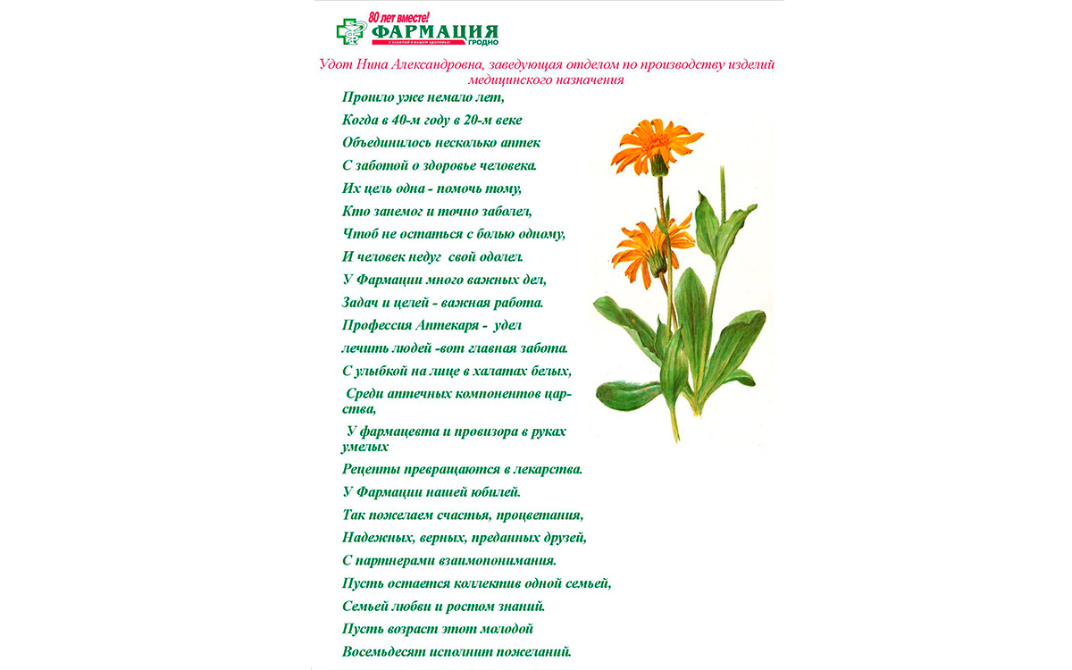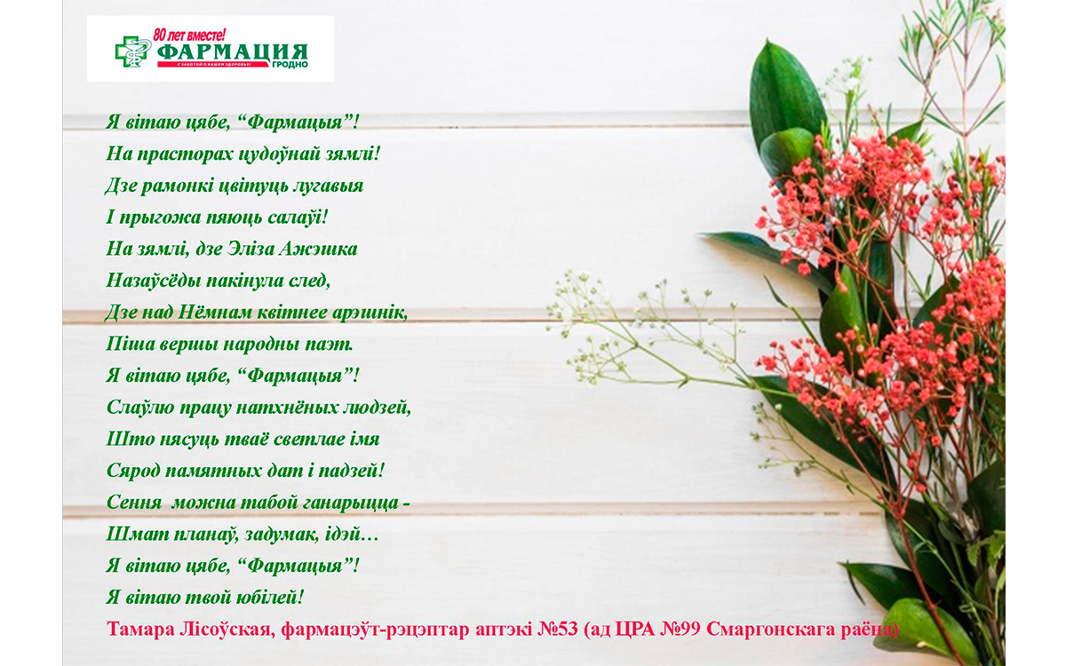 Предлагаем посмотреть и оценить авторские работы «Мастеров золотого пера», призеров конкурса стихов и эссе к 80-летию Гродненского РУП «Фармация»