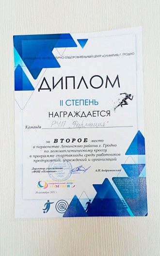 Команда Гродненского РУП «Фармация» приняла участие в первенстве Ленинского района г.Гродно по легкоатлетическому кроссу. По результатам напряженной борьбы нашим работникам удалось занять второе общекомандное место! Елена Хитрик завоевала первое место в личном зачете, Наталья Алябьева и Евгений Хозей – третьи места в личном зачете! Поздравляем с красивой победой!