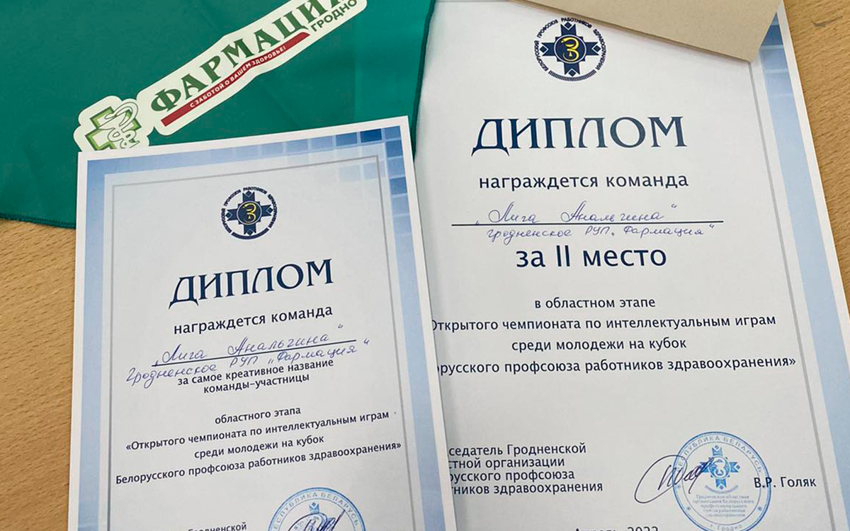 Команда Гродненского РУП «Фармация» с названием «Лига Анальгина» заняла второе место в областном этапе открытого чемпионата по интеллектуальным играм среди молодежи на кубок Белорусского профсоюза работников здравоохранения. Также наши ребята стали обладателем диплома за самое креативное название команды-участницы по результатам онлайн-голосования.