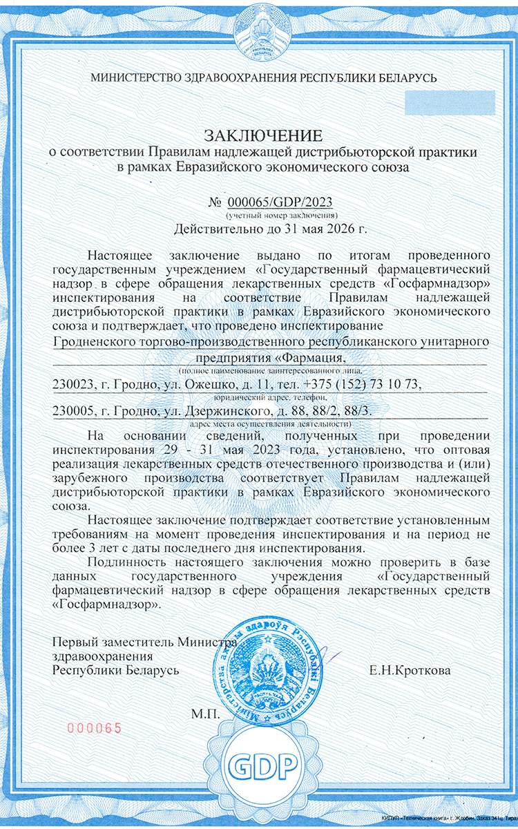 Гродненское РУП «Фармация» получило Заключение Министерства здравоохранения Республики Беларусь о соответствии Правилам GDP Евразийского экономического союза