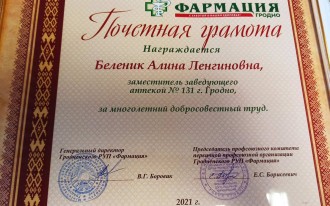 17 лет своей весомой трудовой деятельности, длинною свыше 40 лет, Алина Ленгиновна Беленик посвятила аптеке №131  г.Гродно. Коллеги и сотрудники предприятия в один голос подтверждает, что Алина Ленгиновна-очень чуткий, трудолюбивый и ответственный человек, профессионал своего дела, очаровательная и элегантная женщина, которую отличает высокая степень эрудированности, тактичность, компетентность в многочисленных вопросах, готовность оказывать коллегам всестороннюю помощь.  Внимательность, аккуратность, спокойный и взвешенный подход в решении вопросов помогли ей завоевать уважение в коллективе, получить высокую оценку руководства и благодарность со стороны посетителей аптеки №131.