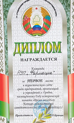 24-26 июня команда Гродненского РУП «Фармация» приняла участие в туристическом слете предприятий и организаций города Гродно «Время молодых», посвященный Году исторической памяти, который состоялся на туристической базе «Химик». В рамках мероприятия члены команды предприятия проявили себя во многих видах спорта,- спортивное ориентирование, полоса препятствий, водная дистанция, волейбол, перетягивание каната, сумо, городошный спорт. Также был проведен конкурс творческого мастерства на летней сцене, в котором наше предприятие заняло первое место. А по результатам смотра на лучшее оформление туристического быта Гродненское РУП «Фармация» стало третьим.