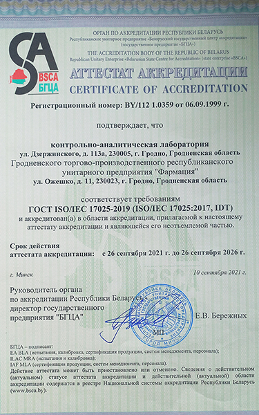 В 2021 году Гродненское РУП «Фармация» внедрило новую версию системы менеджмента качества в соответствии с ГОСТ ISO/IEC 17025-2019, демонстрируя способность постоянно осуществлять свою деятельность в заявленной области таким образом, чтобы соответствовать требованиям настоящего стандарта, своих заказчиков, регулирующих органов и организаций, обеспечивающих признание.
