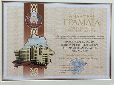 За значительный вклад в реализацию государственной социальной политики в области лекарственного обеспечения населения Гродненское РУП «Фармация» награждено Почетной грамотой Совета Министров Республики Беларусь. -