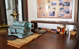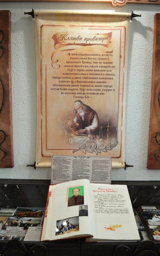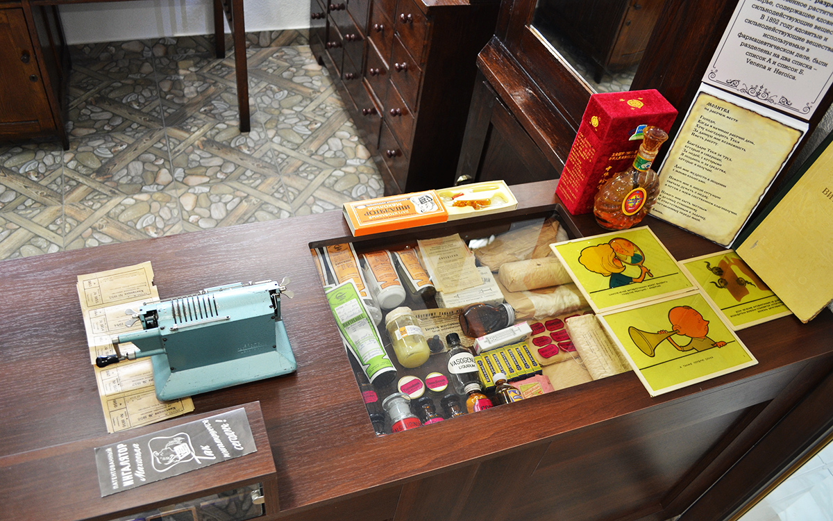 Ознакомившись с историей аптечной службы области в целом, переходим в следующее помещение – торговый зал, который оформлен в соответствии с описанием аптек 19 века. Воссоздан рабочий прилавок аптекаря с кассовым аппаратом, витрина. На рабочем столе заведующего аптекой – книга приказов, написанная чернилами, «калькулятор» прошлого века – деревянные счеты.