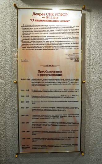 С этой целью был открыт кабинет истории аптечного дела на Гродненщине на базе аптеки № 3 г. Гродно, ул. Антонова, 4. Выбор места неслучаен, ведь данная аптека сама справедливо гордится своей более чем 70-летней историей, лекарственную помощь работники аптеки № 3 оказывали и в годы Великой Отечественной войны.