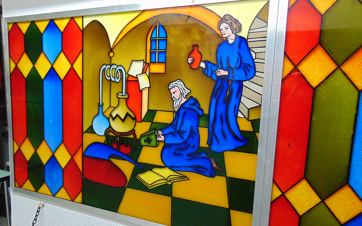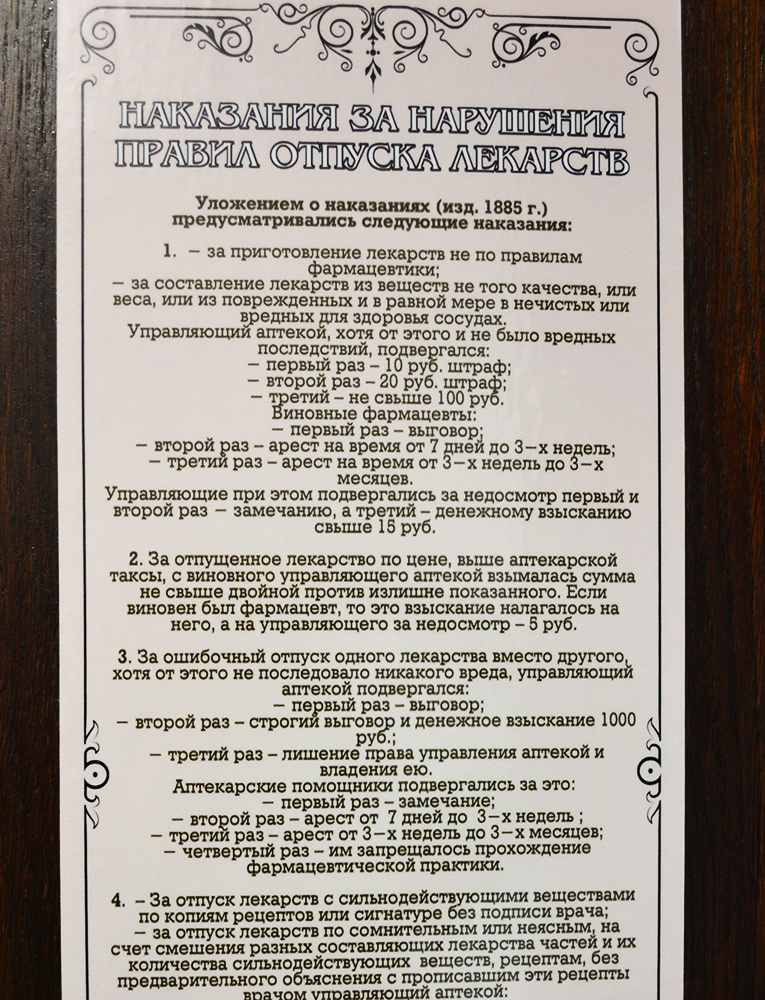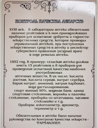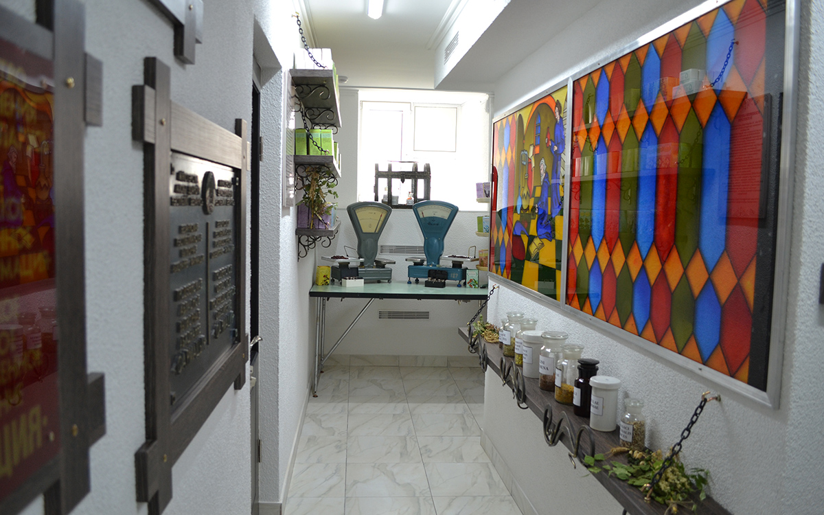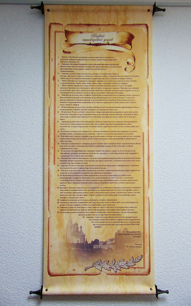 На стилистически оформленных свитках и стендах изложены интересные исторические факты, повествующие об изменениях аптечного дела с эпохи средневековья и до настоящего времени.
