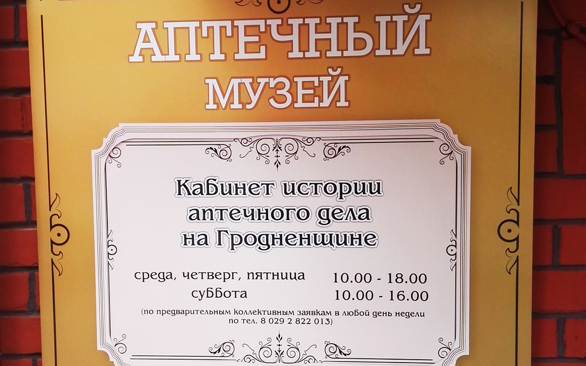 Музей история аптечного дела на Гродненщине функционирует в здании аптеки №3 по адресу г.Гродно, ул.Антонова,4 (вход бесплатный)