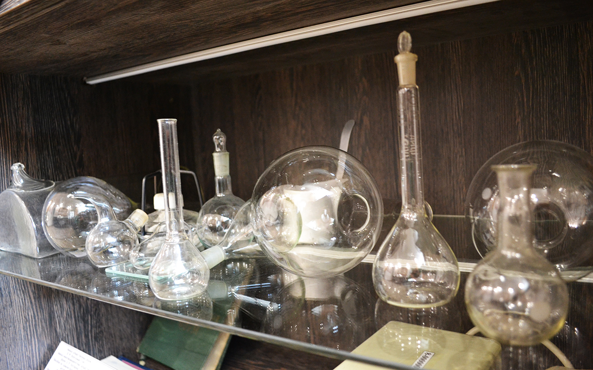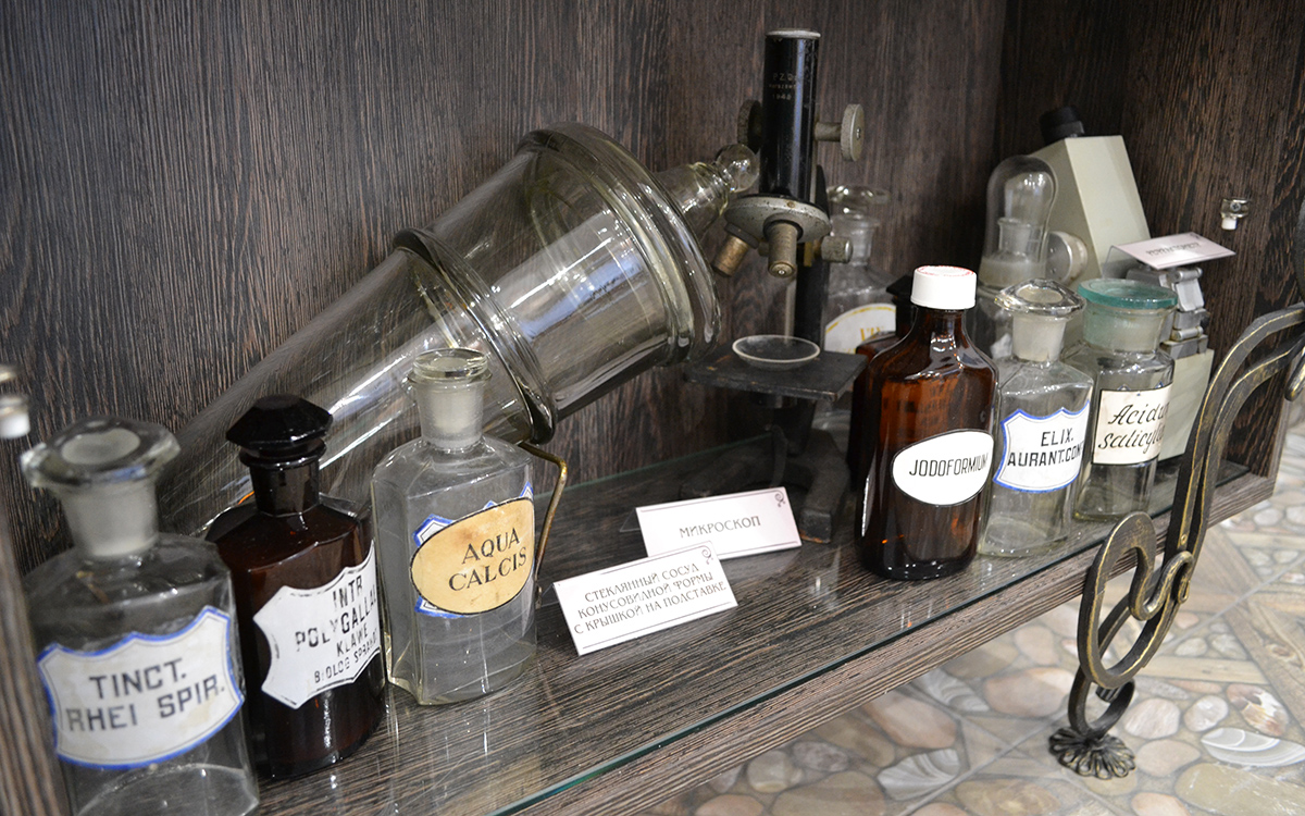 Войдя в кабинет истории, сразу оказываемся в выставочном зале, оборудованном витринами, в которых размещены экспонаты, имеющие отношение к аптечному делу различных времен.