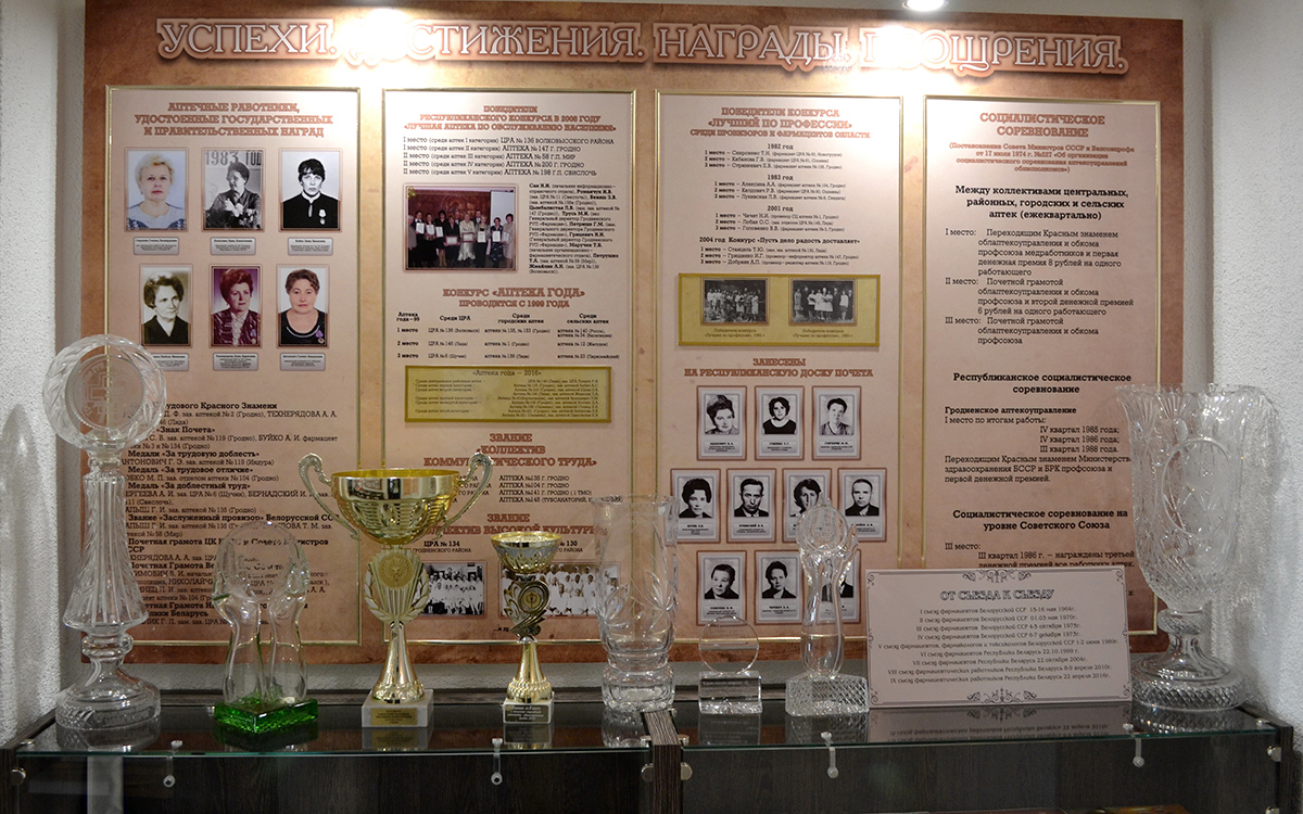 Особое внимание уделено ветеранам аптечной службы предприятия, которые в разное время внесли значительный вклад в развитие и функционирование аптечных организаций нашей области. Данная информация представлена в альбомах, фотографиях аптек и аптечных работников, руководителей аптечной службы Гродненской области и БССР с послевоенных лет и до настоящих времен, в том числе «Книга Народной Славы» с фотографиями и воспоминаниями участников Великой Отечественной войны.