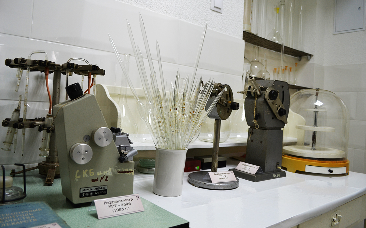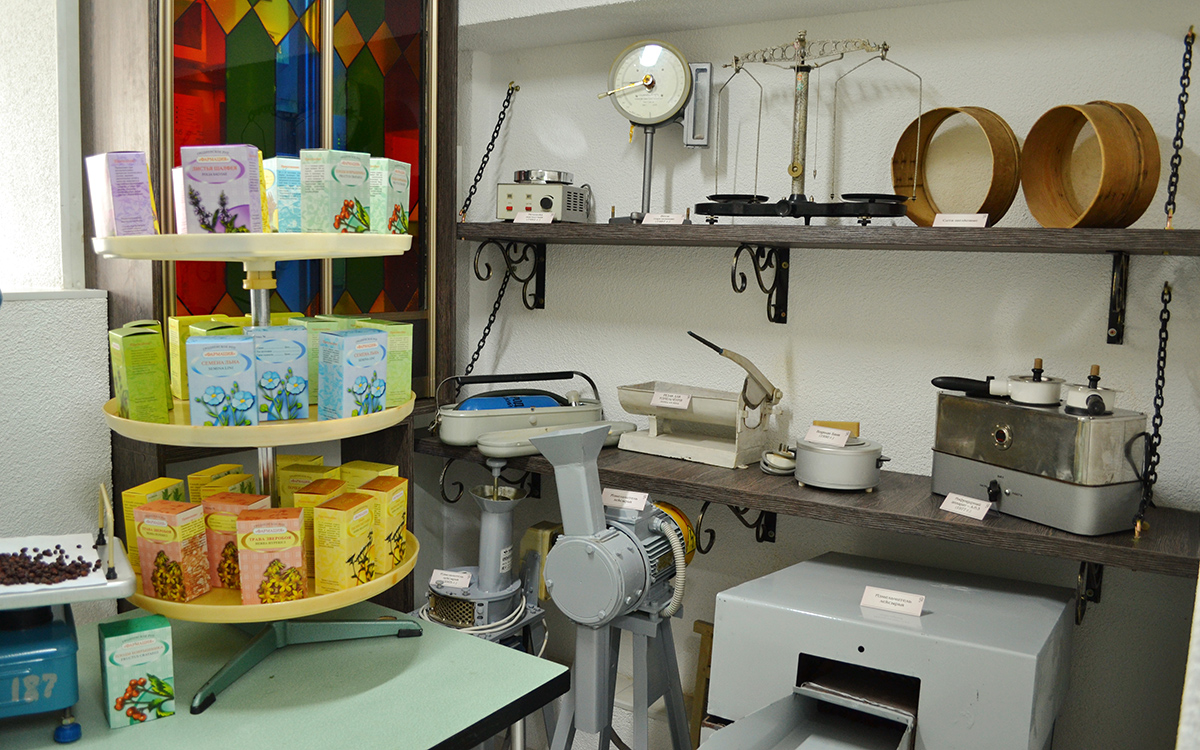 О том, как растительное сырье измельчается и превращается лекарство, представлено в помещении для измельчения и фасовки лекарственного растительного сырья. Здесь представлены и резаки 19 века и современные измельчители, а также сита, аптечные весы.