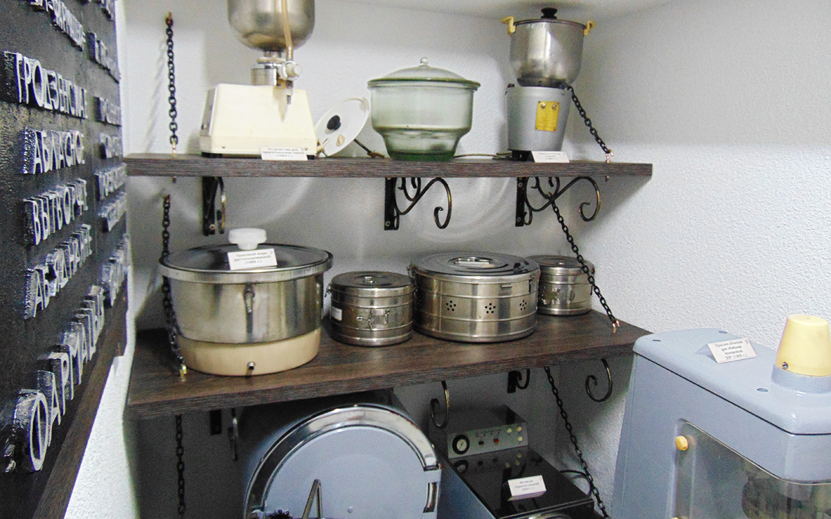 В музее представлены различные приборы и аппараты, которые помогали аптекарю в процессе изготовления лекарств. На стеллажах, выполненных в стиле ретро с ковкой и цепями, представлены сушильный шкаф, автоклав, дистиллятор, приспособление для обжима колпачков, мешалки, измельчители, ступки разных величин и т.д.