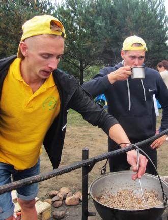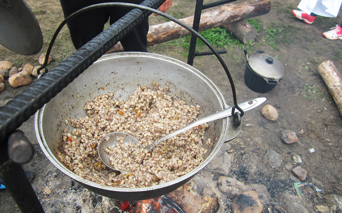 Утро второго дня началось с приготовления перловой каши. В кашу добавили масло, мак, изюм, курагу, мед. Получилась очень-очень вкусная полевая каша. Марина Митрахович приготовила из лаваша розетки для дегустации каши, а для жюри блюдо подали в ступке. Аптечная тема прослеживалась и в подаче, и в защите блюда.