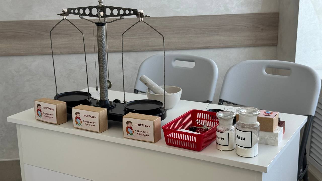 Ребята помогают коту Фармику справится со сложными задачами. Школьники измельчают в ступках настоящую субстанцию, взвешивают на аптекарских весах и высчитывают дозировки. Симуляционная аптека дополнена местом врача, где ребята проводят осмотр пациента, ставят диагнозы и выписывают рецепт.
