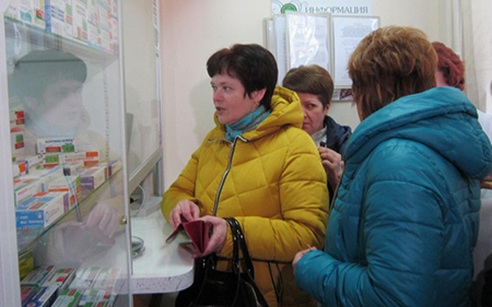 Ко времени открытия новой аптеки перед входом собрались посетители, и, наконец, лента перерезана, вход открыт.