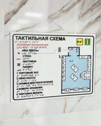 В тамбуре аптеки есть тактильная мнемосхема, которая помогает правильно сориентироваться на объекте. На ней размещены безопасные пути движения к зонам получения услуг.