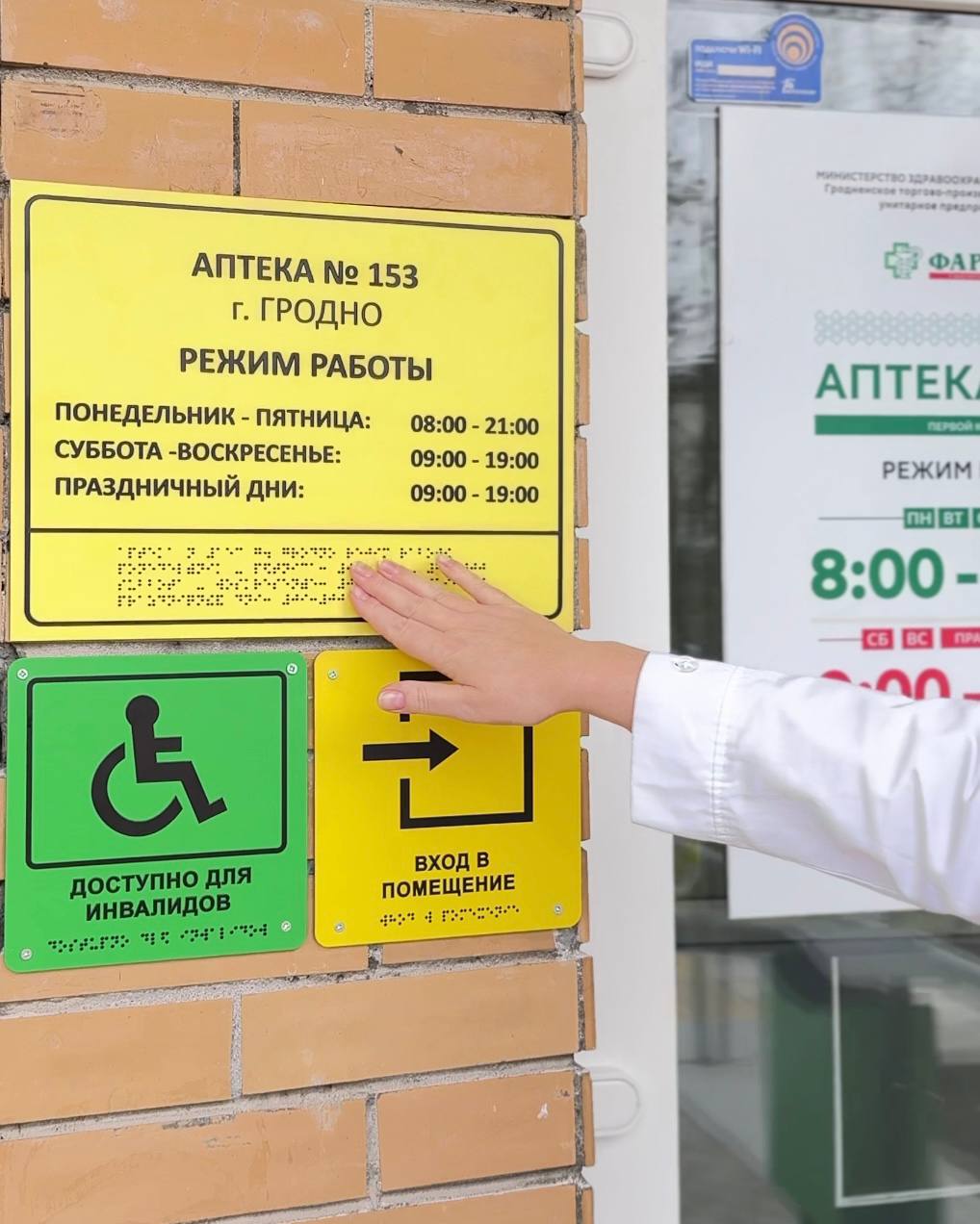 На входе встречает табличка с режимом работы аптеки на ярко-желтом фоне и шрифтом Брайля. Желтый — это последний цвет спектра, который воспринимает человек, теряющий зрение. Обязательно отмечены желтыми наклейками ступени и дверь.