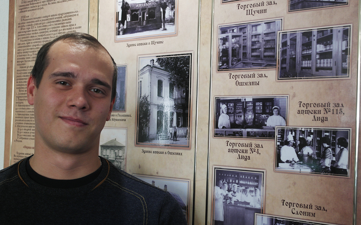 Семен Шейкин, провизор-интерн аптеки №163 г.Лида увидел на стенде фото своей бабушки фармацевта, заведующей отделом аптеки №130 г.Лида Шейкиной Лилии Дмитриевны и сфотографировался, чтоб показать ей фото. Сейчас бабушка на заслуженном отдыхе, а Семен продолжает династию.