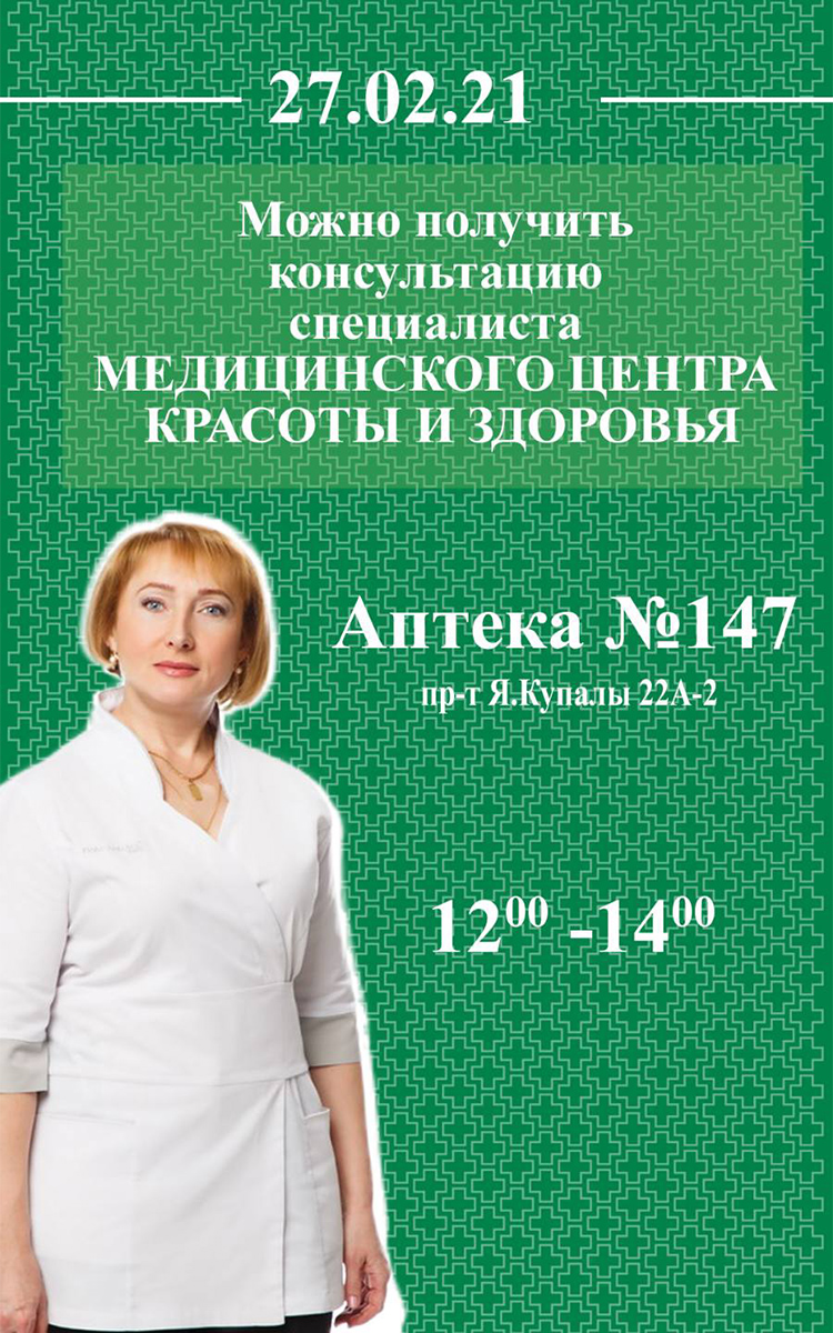 Консультацию специалиста "Медицинский центр красоты и здоровья" г.Гродно можно будет получить 27 февраля в аптеке №147 г.Гродно по  пр-ту Я.Купалы, 22А-2 c 12.00 до 14.00.