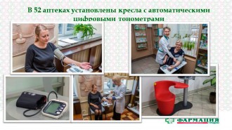 Предоставляются населению и медицинские услуги. В 52 аптеках установлены кресла с автоматическими цифровыми тонометрами, что позволяет посетителям аптек самостоятельно контролировать артериальное давление.