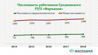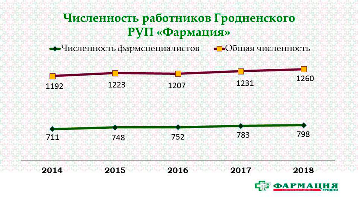 Численность работников предприятия на конец 2018 года по сравнению с предыдущим годом увеличилась на 29 человек и составила 1260 работников. Численность работников увеличилась за счет фармацевтического персонала и связана с постоянным расширением аптечной сети.