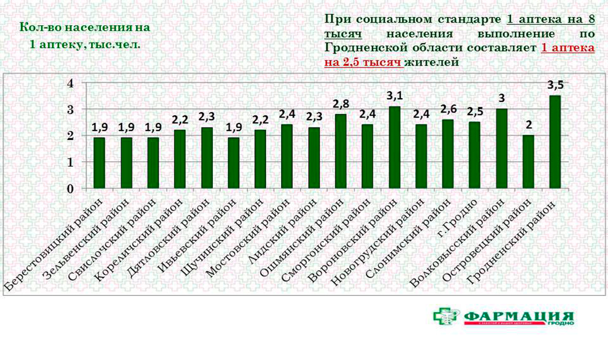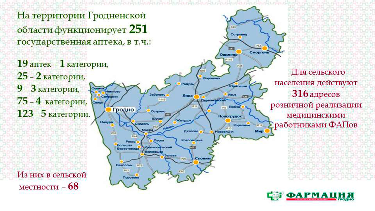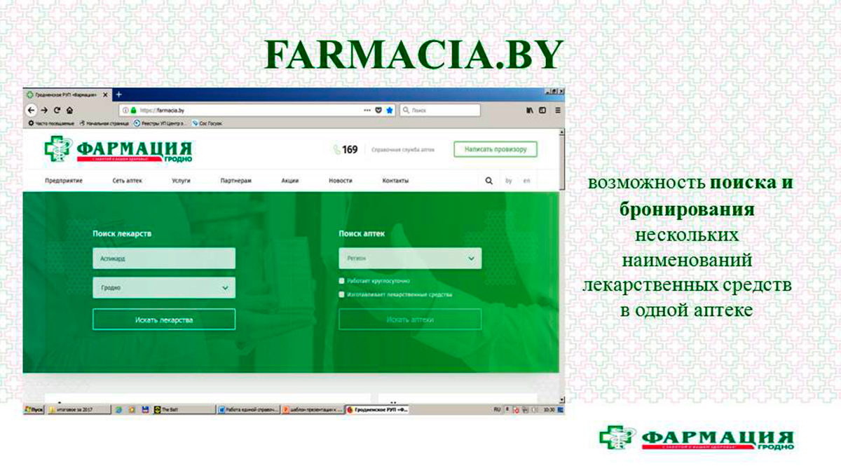 Расширяется спектр сервисных услуг. Для интернет-пользователей данные о наличии в аптеках фармацевтических товаров и их ценах размещены на сайте Гродненского РУП «Фармация» и 5 интернет-ресурсах. С 2018 года предоставлена возможность бронирования нужного лекарственного средства в выбранной аптеке через сайт Гродненского РУП «Фармация».