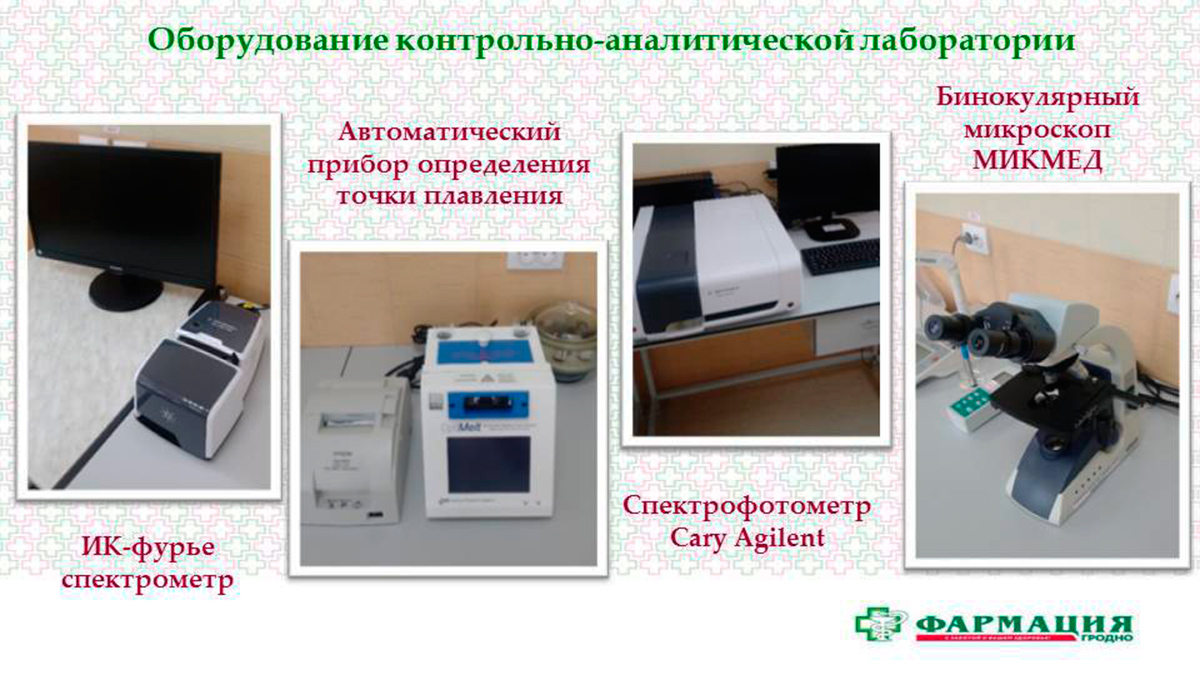Контроль качества реализуемых в аптеках предприятия лекарственных средств проводит аккредитованная контрольно-аналитическая лаборатория. В 2018 году уделено внимание оснащению необходимыми приборами, аппаратами и комплектующими с целью поддержания менеджмента качества лаборатории и обеспечения контроля качества лекарственных средств на высоком уровне. Были приобретены: ИК-фурье спектрометр, спектрофотометр, автоматический прибор определения точки плавления, рН-метр, микроскоп и т.д.