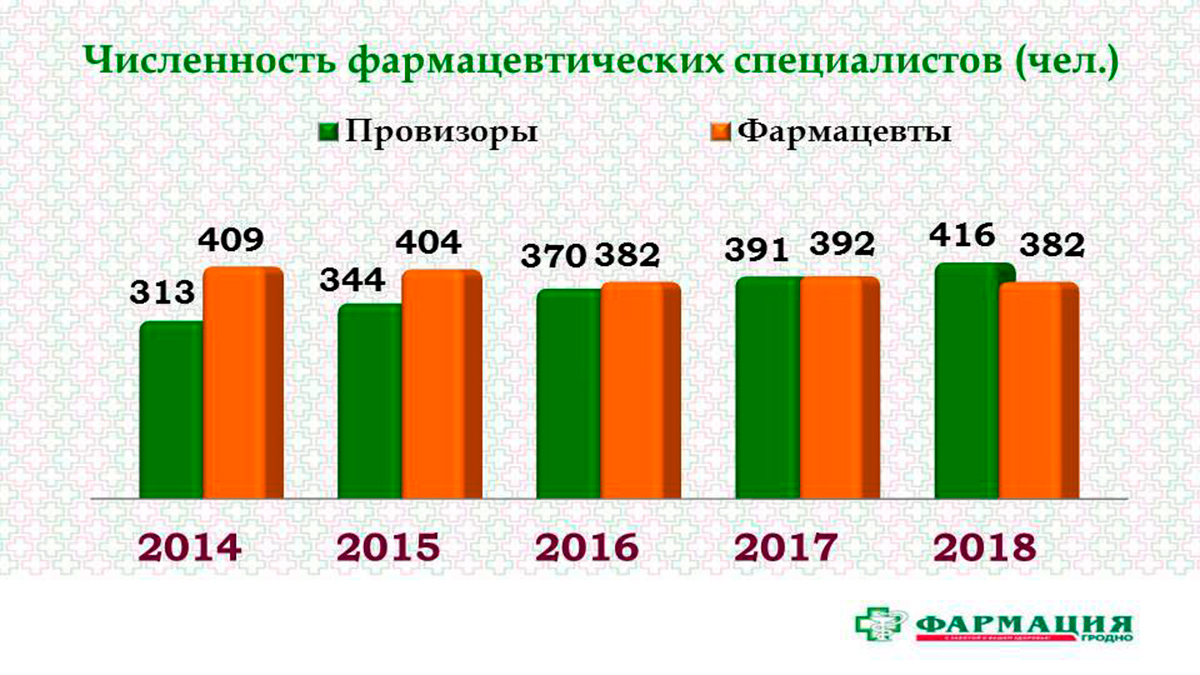 Удельный вес фармацевтических специалистов на предприятии в общей численности работников остался на уровне прошлого года и составил 63,3% или 798 человек. Из них 416 провизор и 382 фармацевта.
