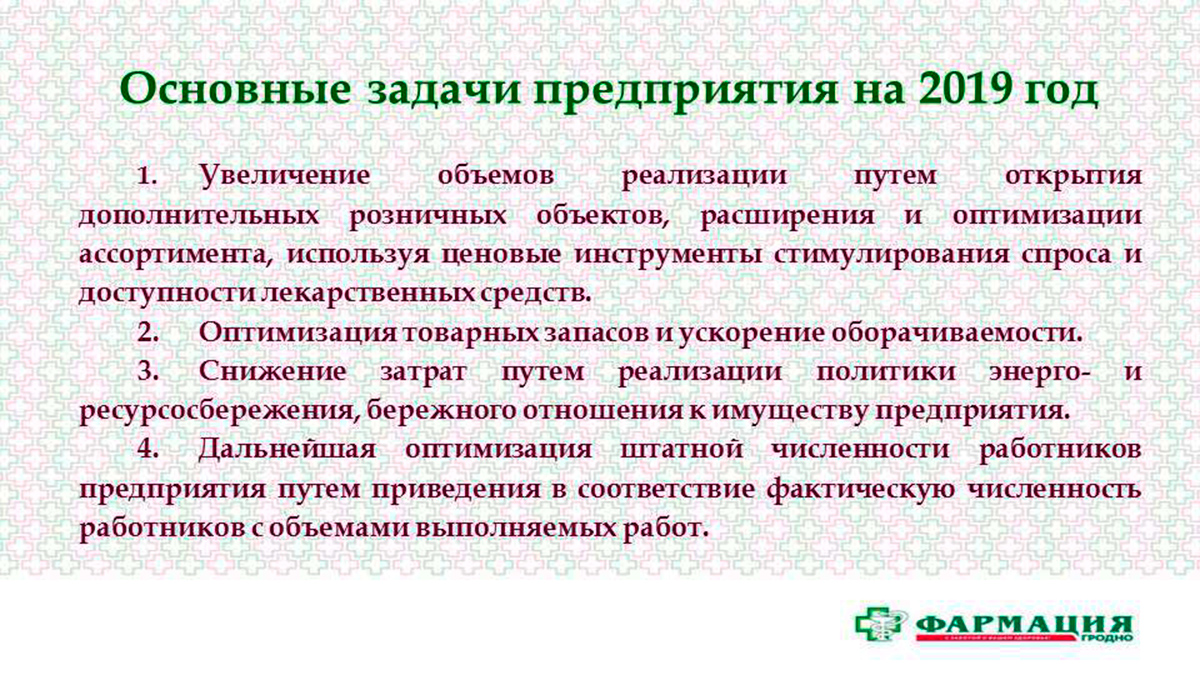 Для совершенствования оказания лекарственной помощи Гродненским РУП «Фармация» на 2019 год запланирован к выполнению ряд основных задач.