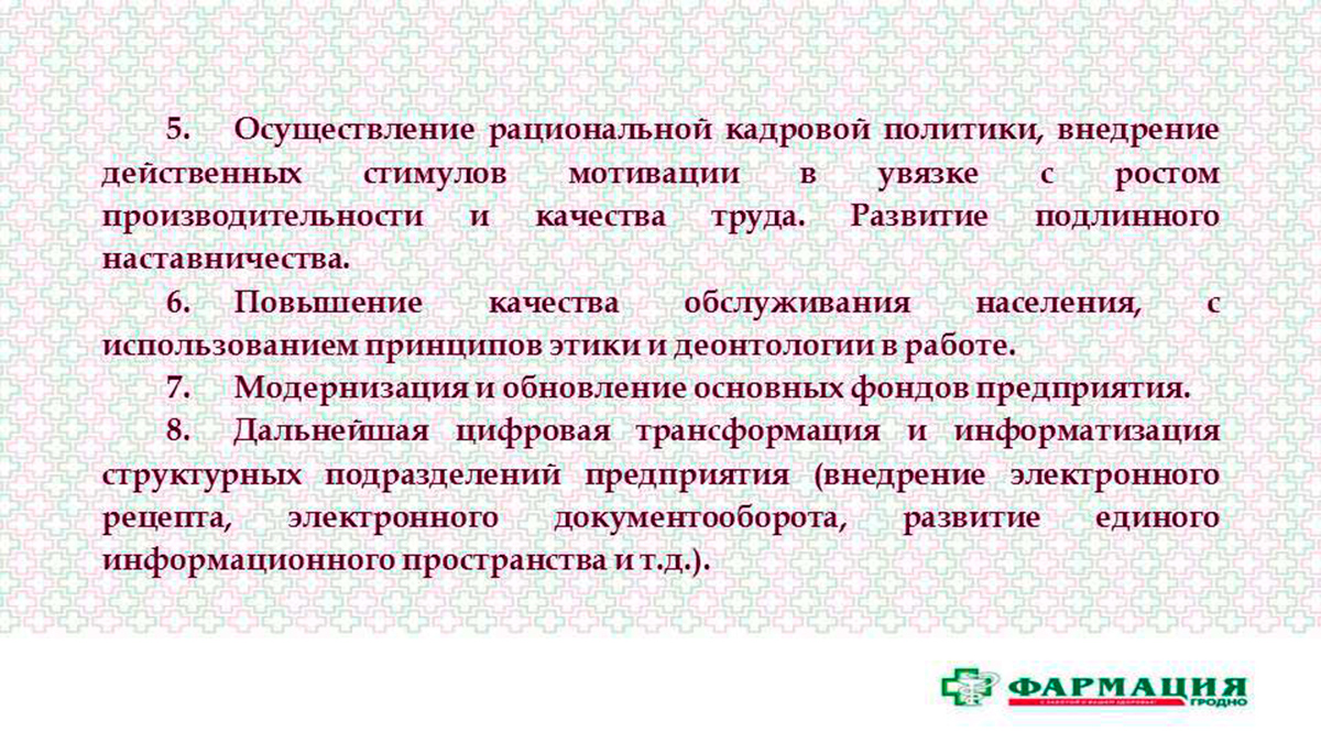 Деятельность Гродненского РУП «Фармация» направлена на обеспечение оказания доступной и качественной лекарственной помощи населению и организациям здравоохранения Гродненской области. И на выполнение этой основной задачи направлены все необходимые ресурсы и усилия как со стороны предприятия в целом, так и от каждого сотрудника на конкретном рабочем месте.