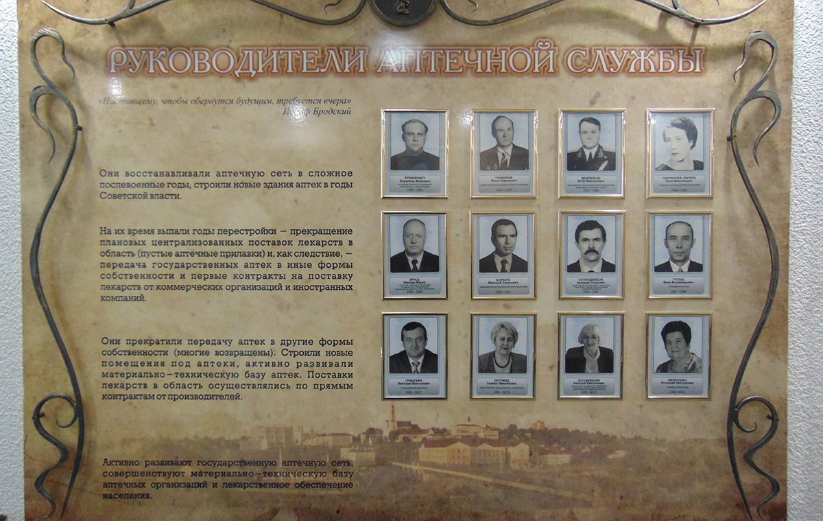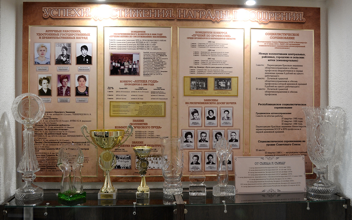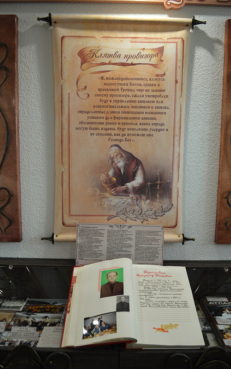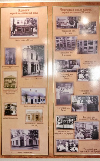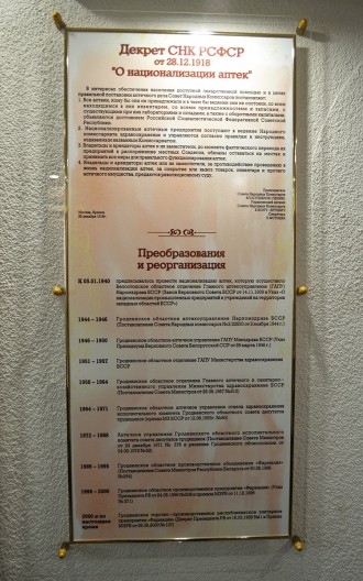 Для того чтобы представить, как видоизменялось аптечное дело, начиная с эпохи средневековья и до настоящего времени, можно ознакомиться с историческими фактами, изложенными на стилистически оформленных свитках и стендах, которые будут интересны многим людям, ведь не найдешь сегодня человека, который не обращался за помощью к аптекарю. Например, это: «История земли Белорусской и Аптечное дело», «Первые аптеки на Гродненщине», «Клятва провизора – XVII век», «Первый Аптекарский Устав – 1789 год», «История лекарствоведенья (с IV века и до настоящего времени)» и многое другое.