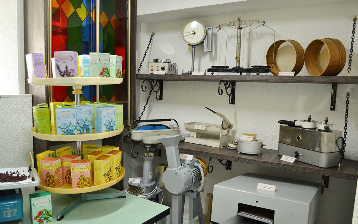 О том, как растительное сырье измельчается и превращается лекарство, представлено в помещении для измельчения и фасовки лекарственного растительного сырья. Здесь представлены и резаки 19 века и современные измельчители, а также сита, аптечные весы.