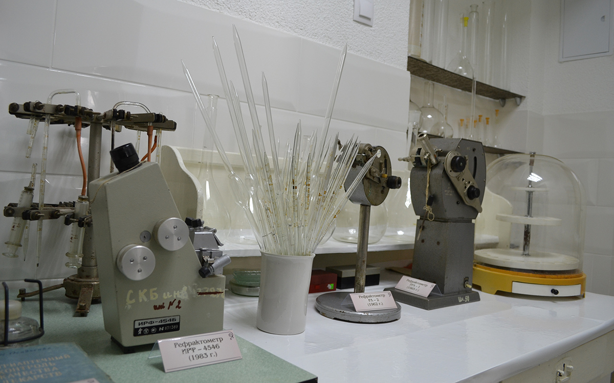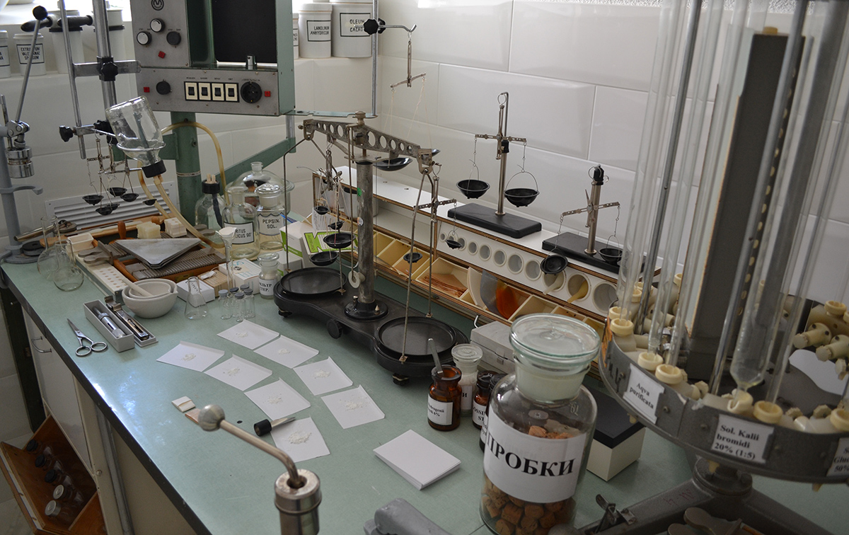 В музее представлены различные приборы и аппараты, которые помогали аптекарю в процессе изготовления лекарств. Это сушильный шкаф, автоклав, дистиллятор, приспособление для обжима колпачков, мешалки, измельчители, ступки разных величин и т.д.