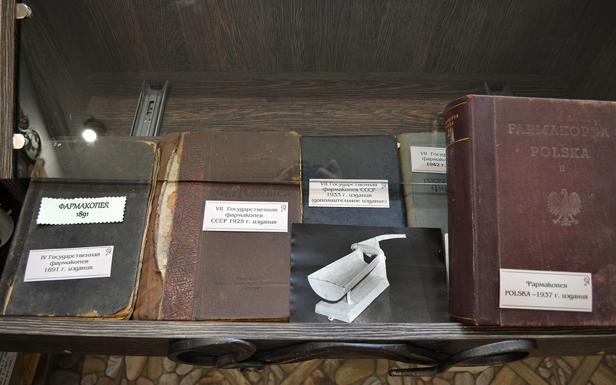Воссоздан рабочий прилавок аптекаря и витрина. Дополняют тематическую экспозицию аптечная посуда и различная аптечная утварь.