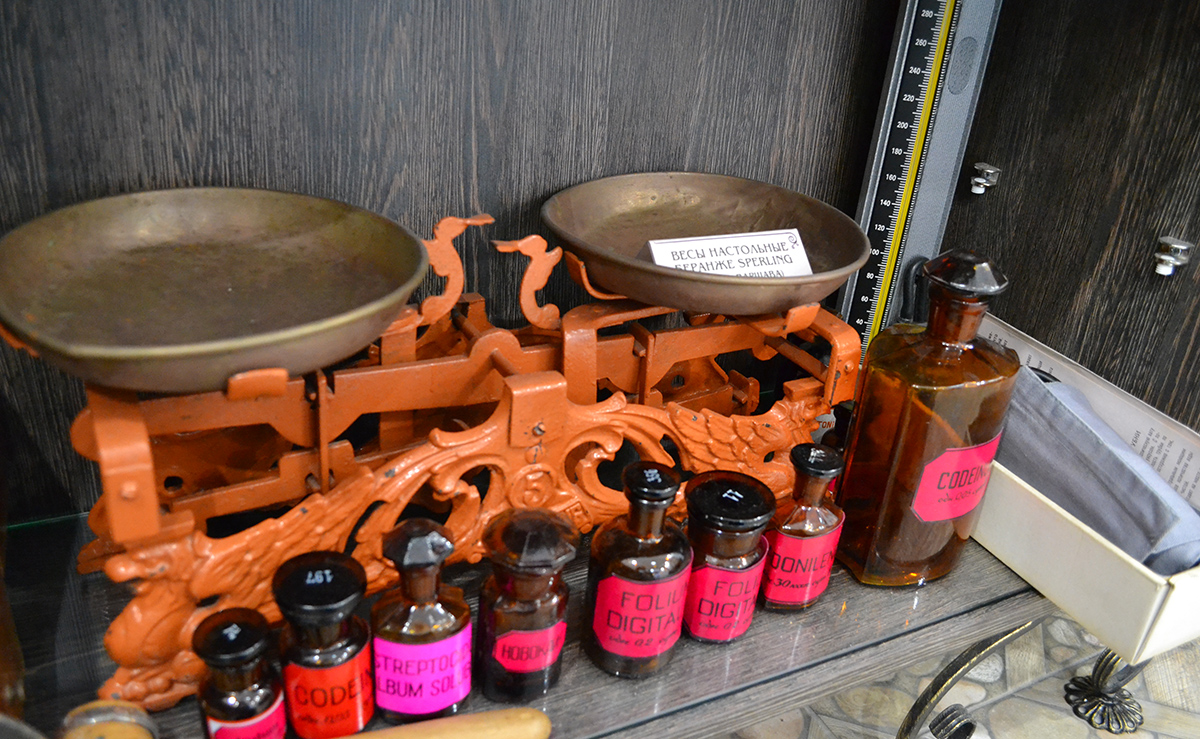 Вызовет интерес и рабочий стол заведующего аптекой с книгами приказов, написанными чернилами, «калькуляторами» прошлого века – деревянными счетами, старыми печатями и штампами аптек.