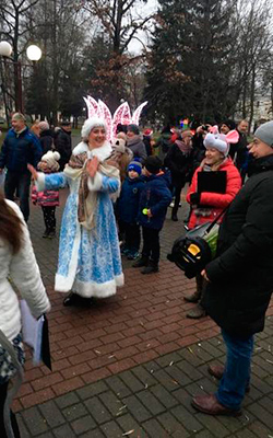 В назначенный час колонна из сказочных героев двинулась от площади Советской к площади Ленина, где состоялось торжественное зажжение новогодней елки и фееричный танцевальный флэшмоб, в котором приняли участие все желающие. Наши Дед Мороз и Снегурочка солировали в первых рядах среди танцующих! И даже непрекращающийся дождь не смог испортить новогоднее настроение и помешать загадать самые заветные желания под новогодней елкой! Огромное спасибо хочется сказать всем сотрудникам Гродненского РУП «Фармация», детям сотрудников, большим и маленьким, принявшим участие в организации и проведении данных мероприятий!