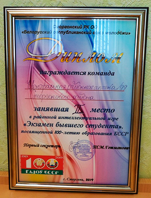 В очередной раз наша команда молодых специалистов ЦРА № 99 Сморгонского района приняла участие в интеллектуальной игре «Экзамен бывшего студента», проводимой районным отделом идеологии по делам молодежи. На этот раз темой игры стала значимая для каждого гражданина Республики Беларусь дата – 100-летие со дня образования БССР. Это событие стало основополагающим в современной истории Беларуси и белорусского народа. Несмотря на то, что мы с ребятами разошлись после окончания интернатуры по подведомственным аптекам – смогли найти время и встретиться, чтобы обсудить как организационные моменты, так и материалы по теме игры.