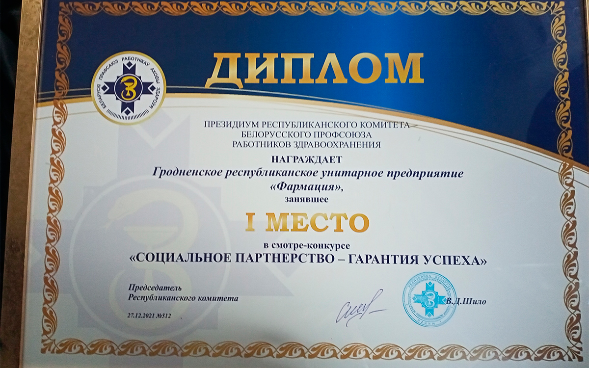 24 февраля в Минске состоялся IV Пленум Белорусского профсоюза работников здравоохранения, в работе которого приняла участие и гродненская делегация. В рамках мероприятия состоялось награждение победителей Республиканского смотра-конкурса «Социальное партнёрство – гарантия успеха». Среди внебюджетных организаций победу одержала Гродненское РУП «Фармация».